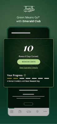 • Manage your Emerald Club profile, view your progress to the next Emerald Club tier and credits toward free rental days (covers base rate, Time and Mileage, only).